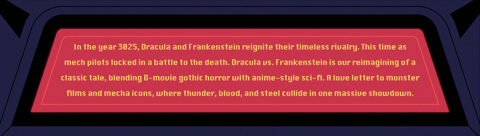In the year 3025, Dracula and Frankenstein reignite their timeless rivalry. This time as mech pilots locked in a battle to the death. Dracula vs. Frankenstein is our reimagining of a classic tale, blending B-movie gothic horror with anime-style sci-fi. A love letter to monster films and mecha icons, where thunder, blood, and steel collide in one massive showdown.