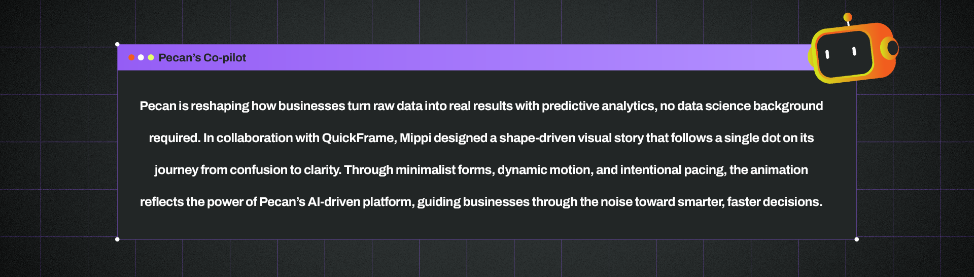 Pecan is reshaping how businesses turn raw data into real results with predictive analytics, no data science background required. In collaboration with QuickFrame, Mippi designed a shape-driven visual story that follows a single dot on its journey from confusion to clarity. Through minimalist forms, dynamic motion, and intentional pacing, the animation reflects the power of Pecan's Al-driven platform, guiding businesses through the noise toward smarter, faster decisions.